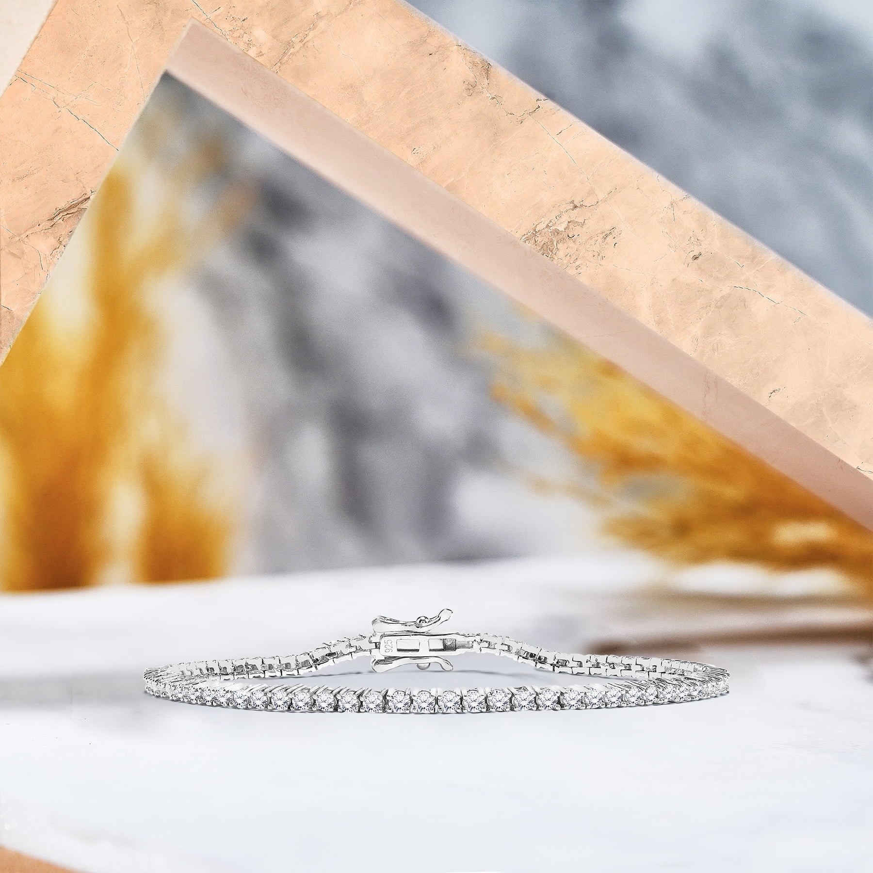 This exquisitely crafted tennis bracelet features 5.5 carats of round-cut cubic zirconia, representing the April birthstone with brilliant clarity and fire. Set in an elegant eternity design and finished with white gold plating, this bracelet combines timeless appeal with durable shine. Designed specifically for women, it offers a refined accessory that complements both formal and everyday attire with expert craftsmanship and lasting elegance.